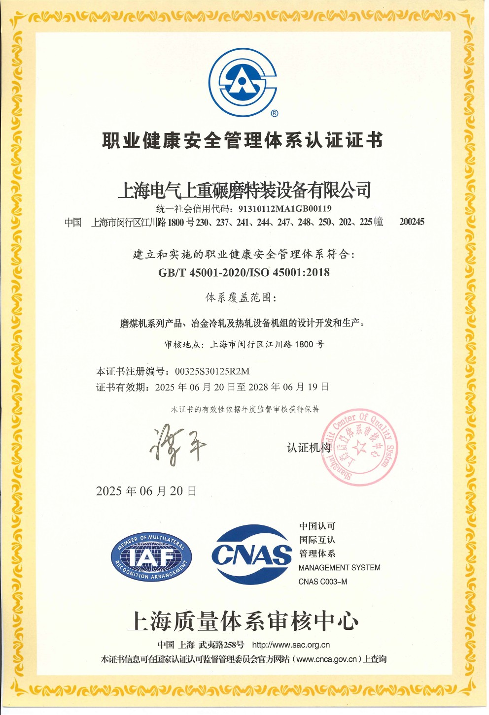 职业健康安全管理体系证书(GBT 45001-2020 2025-06-20至2028-06-19)