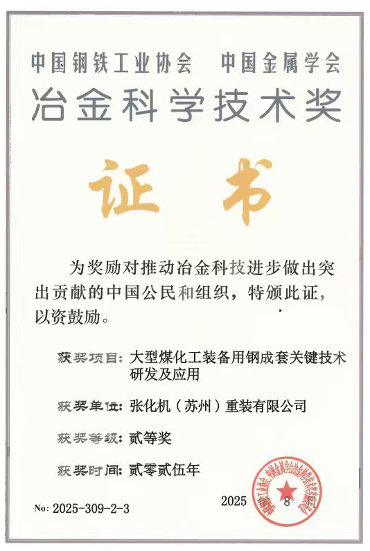 近日,中国冶金行业最高科技荣誉——2025年度中国钢铁工业协会、中国金属学会冶金科学技术奖评选结果正式揭晓,张化机(苏州)重装有限公司联合江阴兴澄特种钢铁有限公司、中国石化工程建设有限公司、东北大学共同申报的“大型煤化工装备用钢成套关键技术研发及应用”项目,凭借在高端材料应用与装备制造领域的突破性成果,成功斩获二等奖。