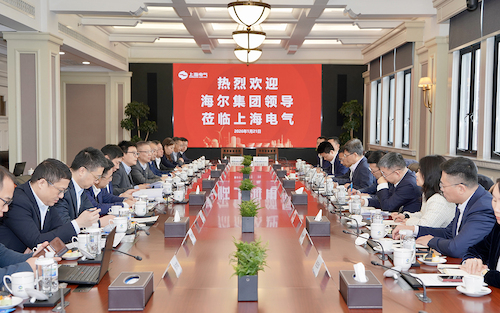 上海电气党委委员、副总裁贾廷纲,海尔集团政企事务执行总经理徐志博代表双方在协议上签字。