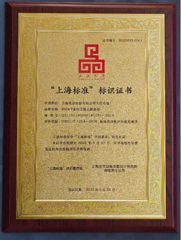 10月29日在上海市2025年“世界标准日”主题活动上,上海电器股份有限公司人民电器厂(简称“人民厂”)制定的《RMW3系列万能式断路器》企业标准,成功入选全市2025年度12项“上海标准”。该标准作为人民厂高端制造领域核心技术成果,既体现其在低压电器领域的技术引领力,也以严苛指标和先进规范填补行业空白,为新型电力系统转型提供“上联方案”。