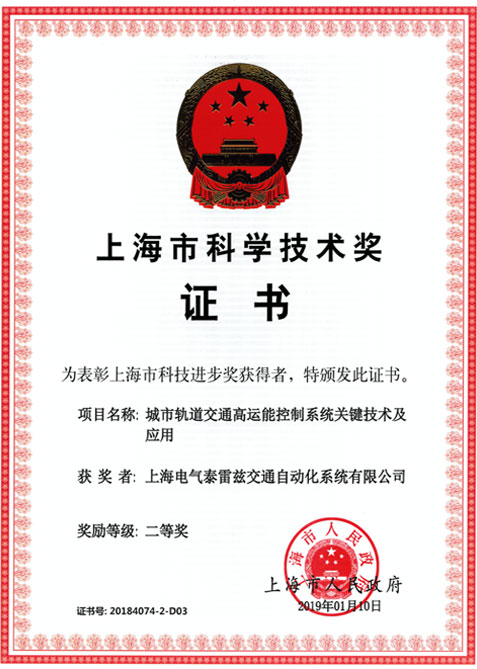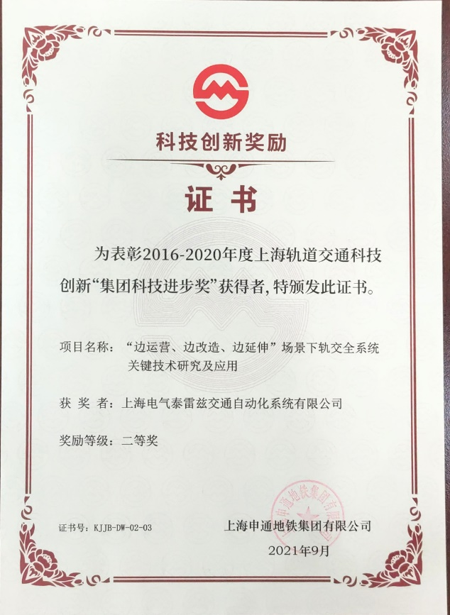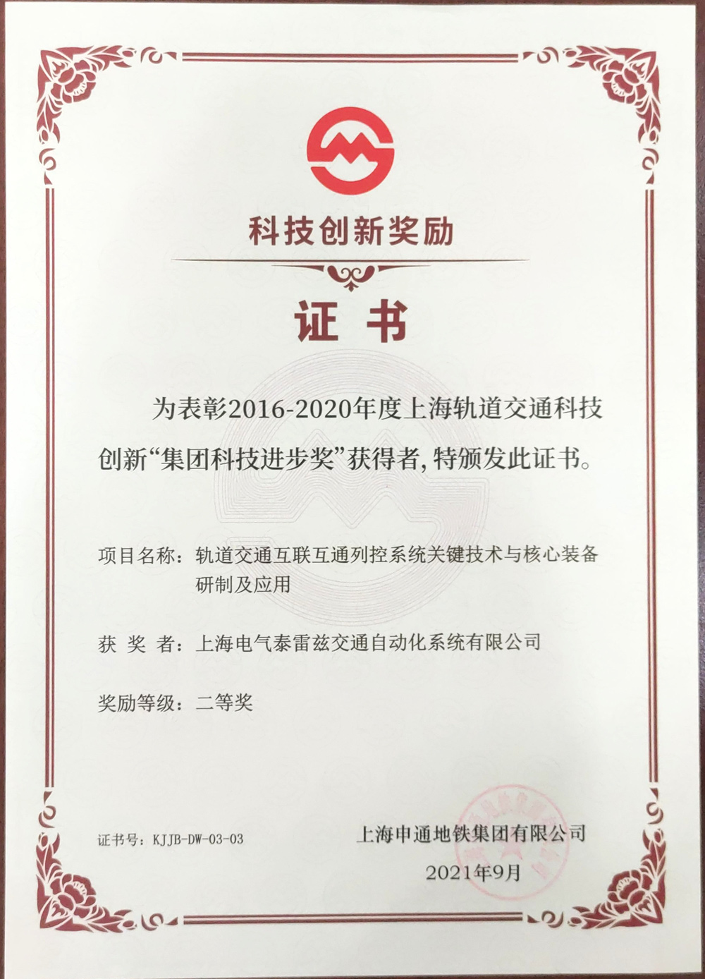 科技创新奖励证书(公司已更名为:上海电气集团交通自动化系统有限公司)