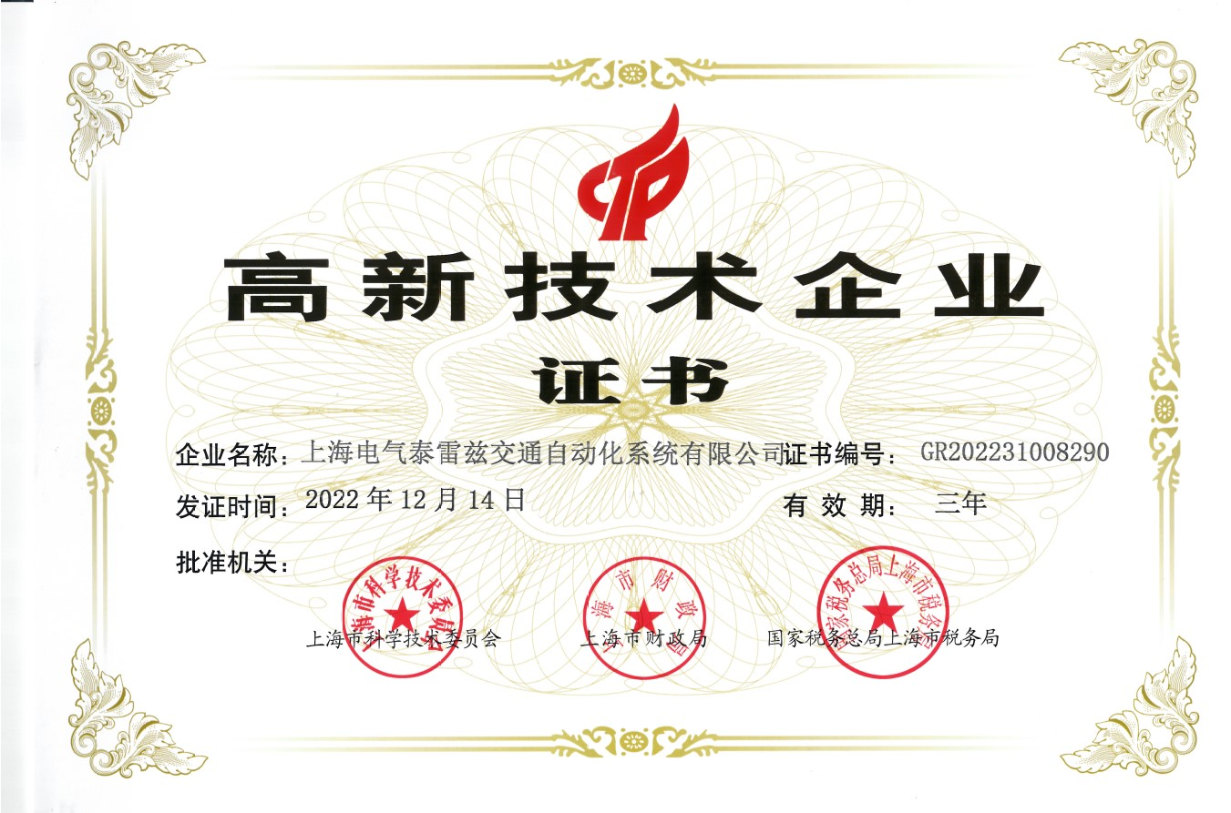 高新技术企业证书(公司已更名为:上海电气集团交通自动化系统有限公司)
